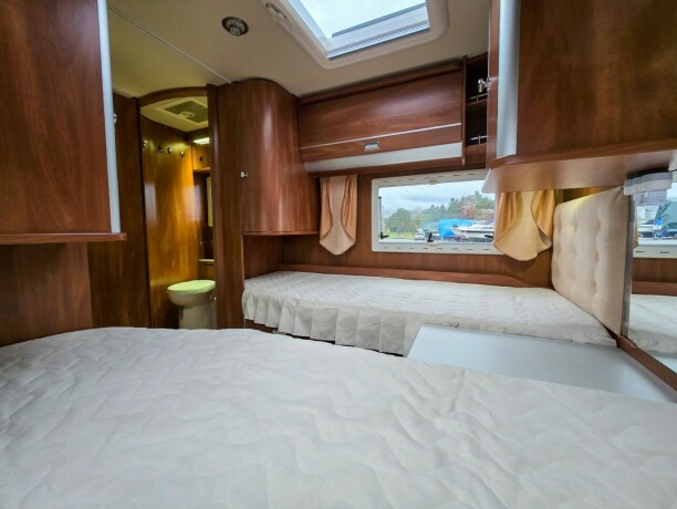 Innvendig finner du praktiske løsninger som TWIN-BEDS, senkeseng over førerhuset, et todelt bad med dusjkabinett, og et fullt utstyrt kjøkken med stekeovn, kjøl- og fryseskap. Komforten ivaretas av blant annet ALDE-varme og manuell klimaanlegg for bil-delen.